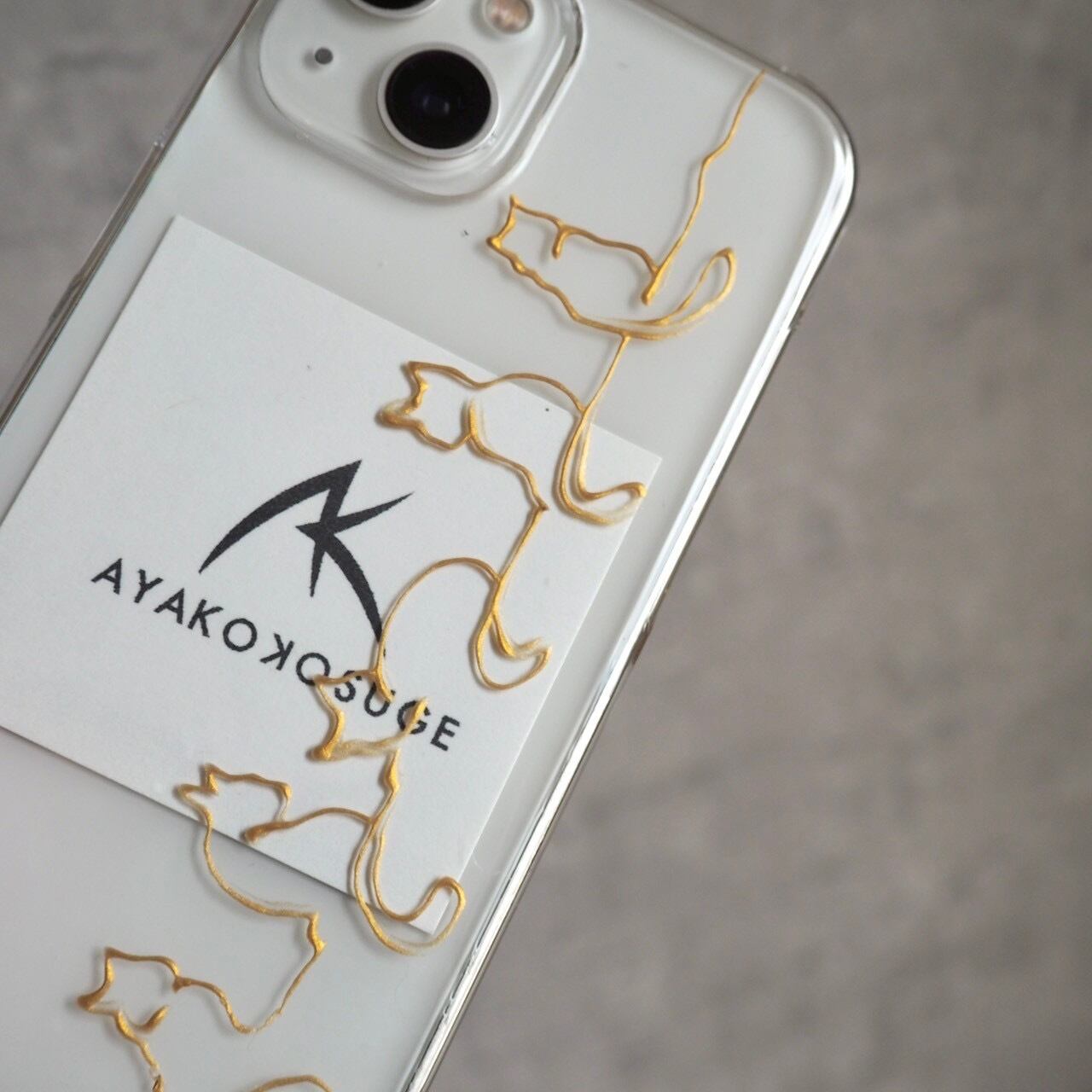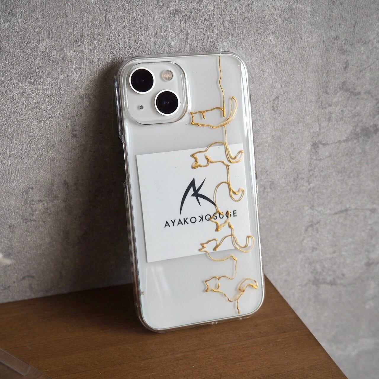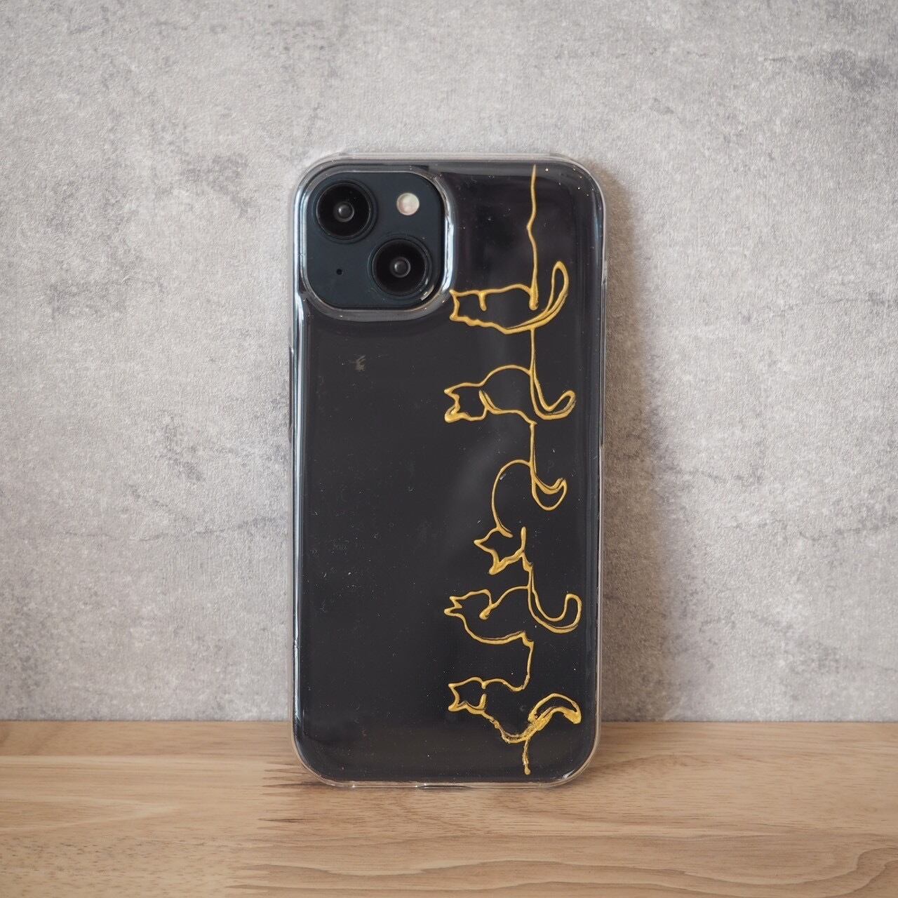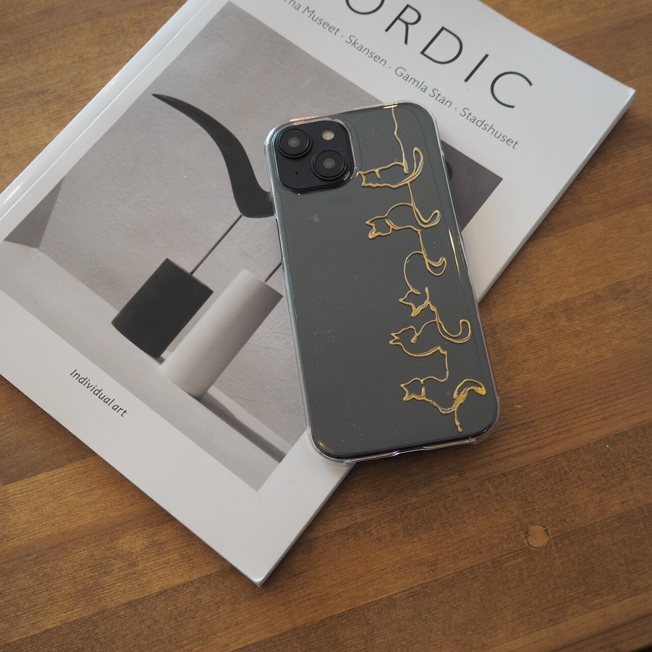 5匹の猫がゴールドの線画で描かれたスマホケース